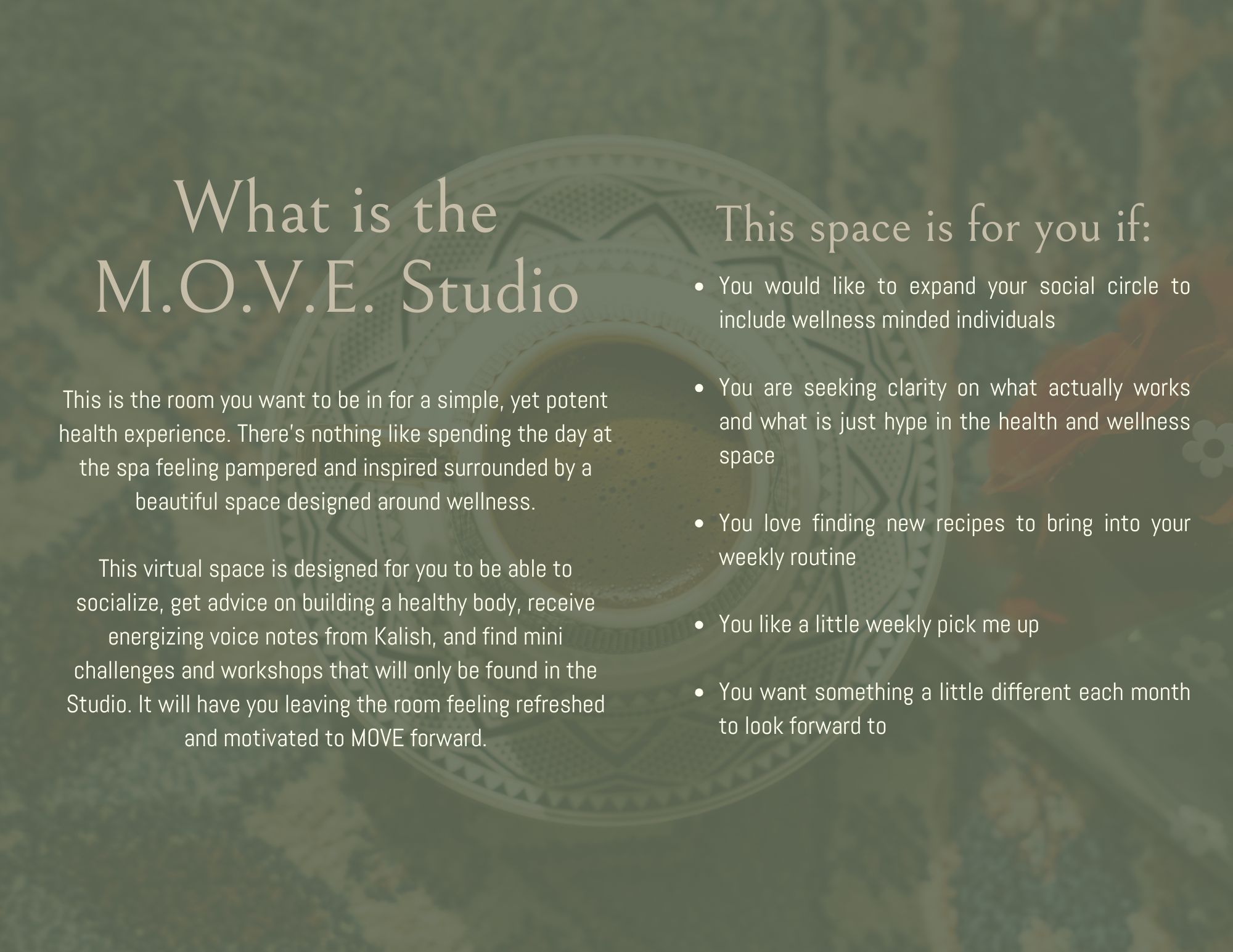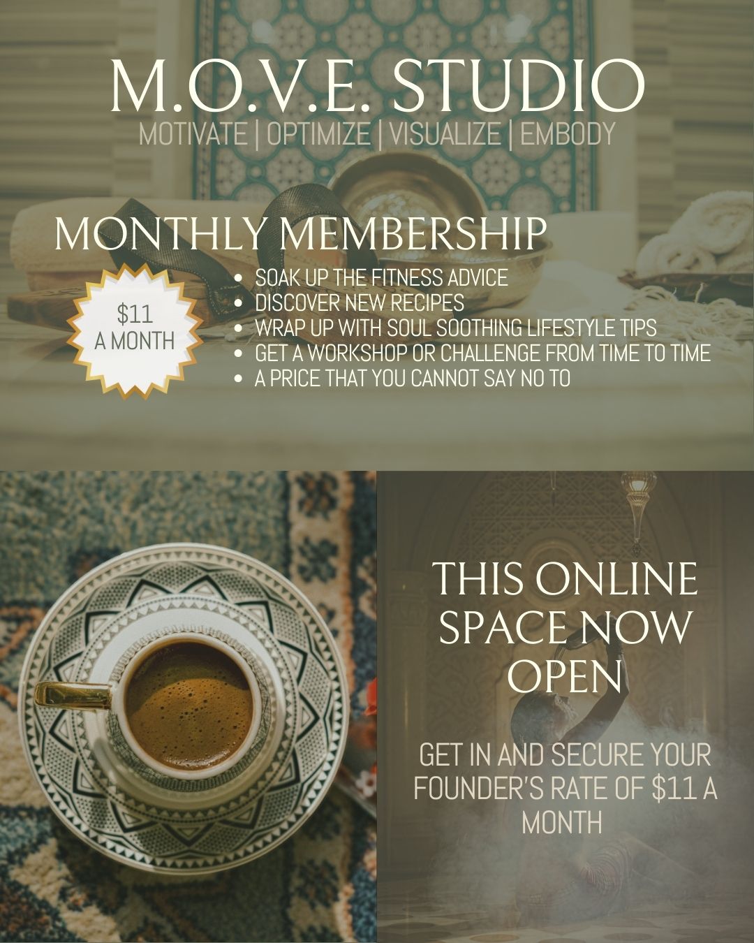 I’ve created the M.O.V.E. Studio based off my signature methodology for developing motivation, optimizing health and fitness, powerful visualization, and stepping into full embodiment of the person you are destined to become.